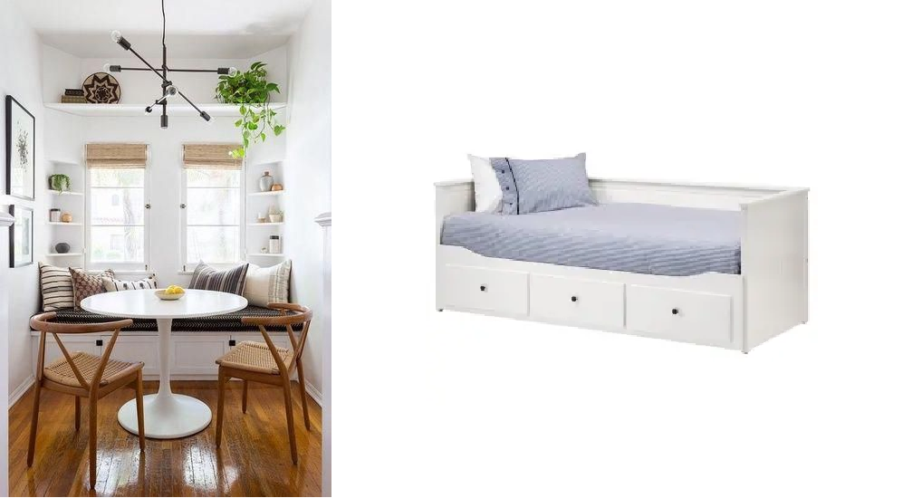 Идея использования кушетки в обеденной зоне. «Хемнэс» — справа, стоимость — 27 999 рублей