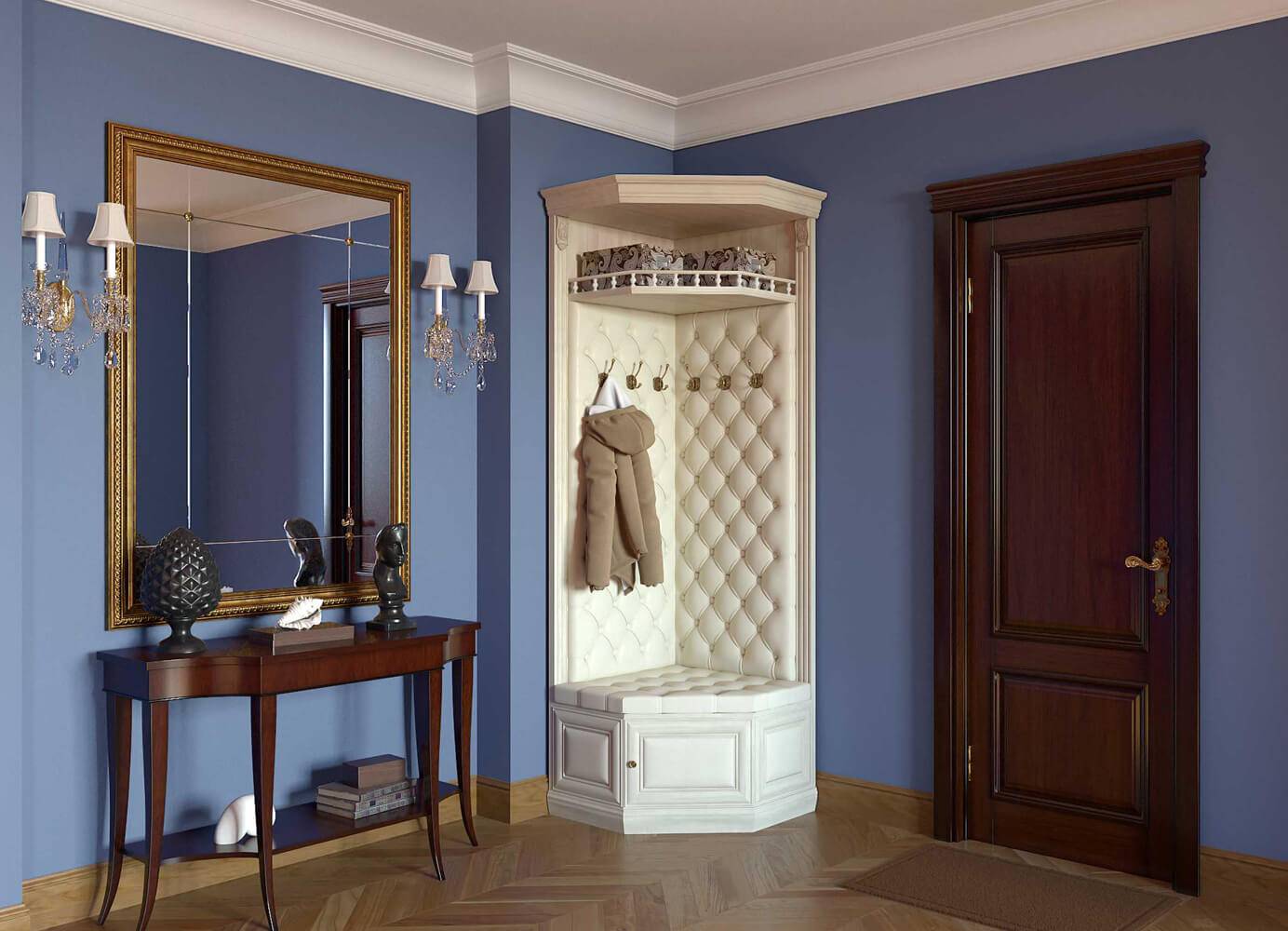 Классические прихожие в коридор выглядят респектабельно и элегантно. Мебель в классическом стиле выдержана в традициях прошлого. Ее линии чисты и изящны. Обязательно используется декор: фигурное обрамление дверных филенок, карнизы, элементы резьбы и т. п. Самые популярные цвета — белый (при этом резной декор может быть позолочен) либо цвет темного дерева. Фигурные мебельные ручки и крючки для одежды непременно должны быть «под старину». Для мягких элементов используется стеганая кожа или дорогой гобеленовый текстиль.