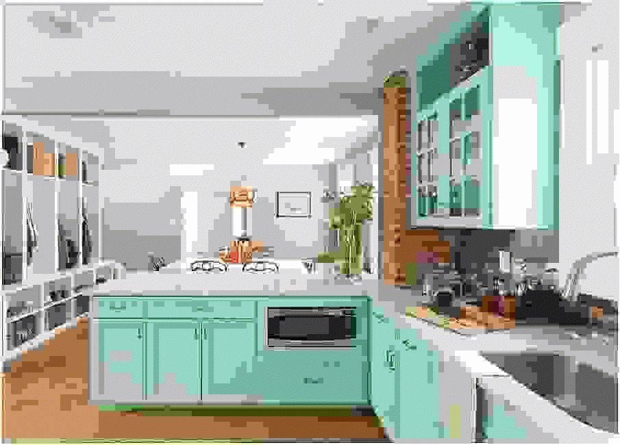 - Если нужно визуально увеличить пространство, используйте больше бело-молочных оттенков. Например, низ кухни можно выполнить в мятном цвете, а верхние навесные шкафы в белом.