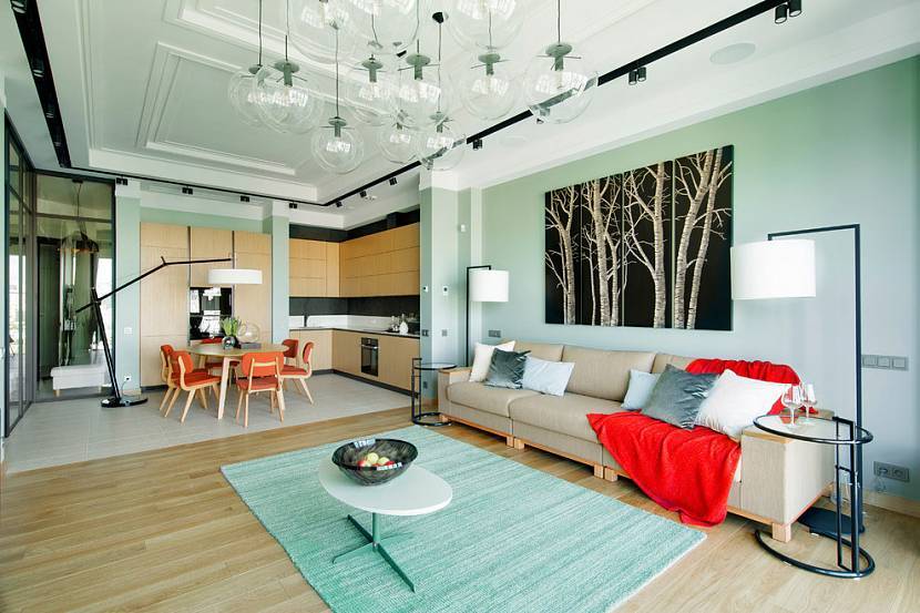 Привычная обстановка с участием светлой палитры будет эффектно смотреться на фоне мятного. В этом направлении интерьера одним из главных атрибутов считается гипсовая лепнина. Ее создают в золотистом или серебристом оттенке. Главное, чтобы при этом фон стен был мятным и занимал больше пространства, чем другие цвета.