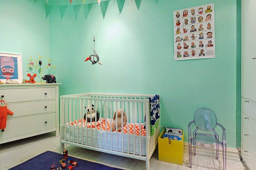 Мятный цвет сочетает успокаивающую силу синего цвета с питательной силой зеленого цвета, таким образом, симбиоз обоих цветов делают безмятежный оттенок, который оптимален для детской. Зеленый тон будет уменьшать беспокойство ребенка, обеспечивая глубокое инстинктивное чувство физического благополучия. Синие тона расслабляют как ум, так и тело, и было доказано его влияние на физическое снижение артериального давления, частоты сердечных сокращений и дыхания – все это нужно, чтобы обеспечить ребенку крепкий и здоровый сон.