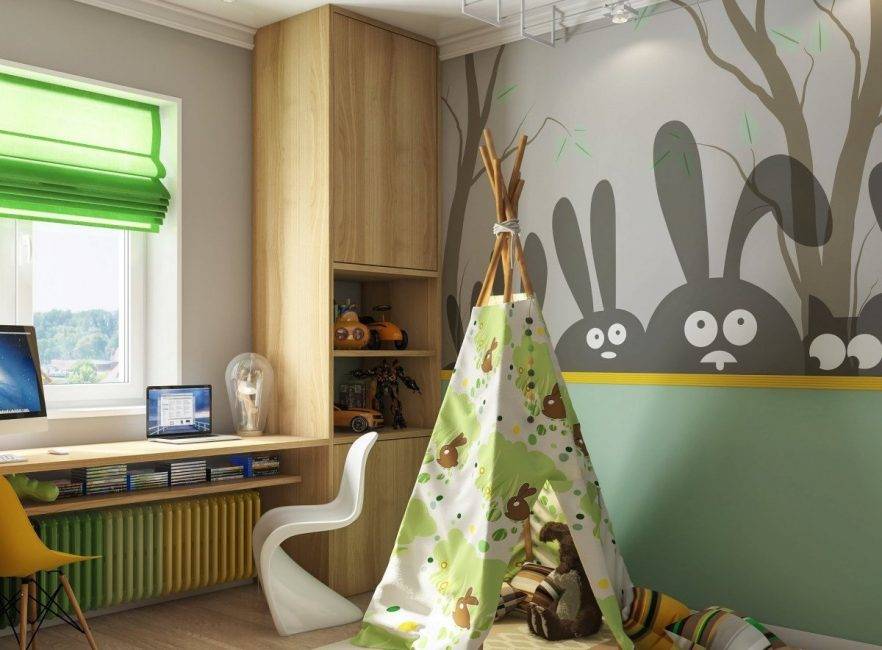 Разбавив обои цвета мяты в интерьере жёлтыми, ярко-зелёными или синими элементами декора, можно создать очень интересную детскую комнату, в которой благодаря основе, будет царить свежесть и ненавязчивость.