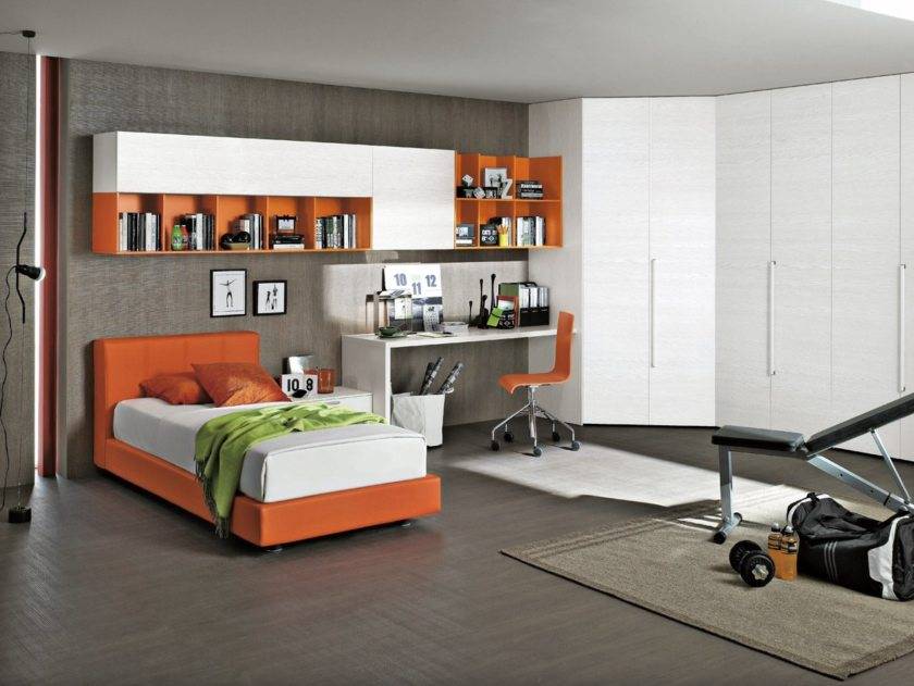 Желательно создать контраст между стенами, полом и потолком, используя сочные цвета, необычные орнаменты. Если мальчик увлекается спортом, можно дополнить подростковую комнату спортивным уголком. Для этого потребуется установить шведскую стенку, тренажеры или подготовить место для силовых снарядов.