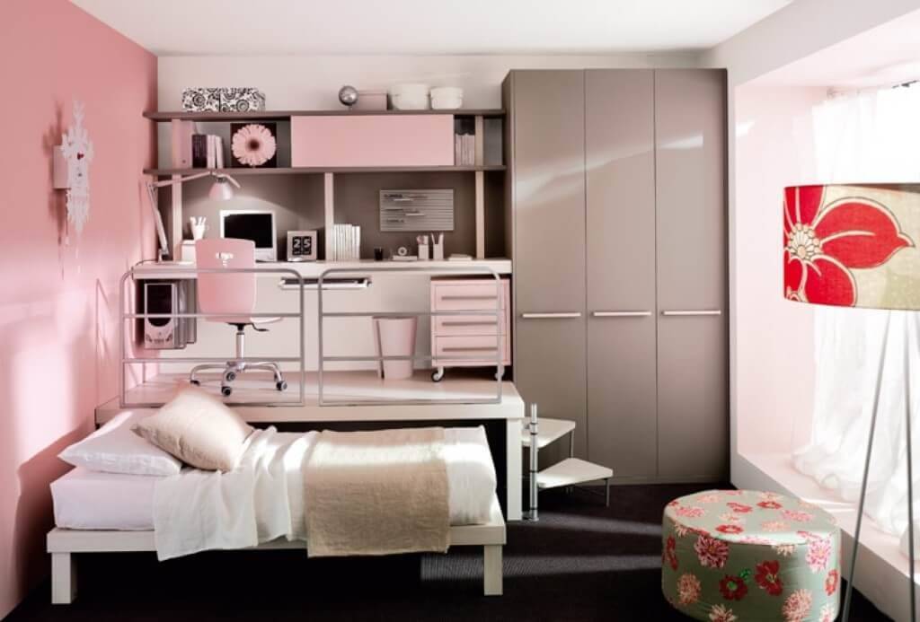 В крохотном помещении, предназначенном для проживания, учебы и отдыха молодой леди, нужно максимально использовать свободное пространство стенок. Все учебные материалы, книги можно расположить на подвесных полках. Вдоль подоконника можно расположить столик для обучения. По бокам от него можно установить стеллаж для сувениров, декора и книг, платяной шкаф. Кровать следует устанавливать параллельно организованному столику, оставляя достаточное пространство между этими зонами для перемещения. Заменить кровать сможет раскладная софа, располагаемая перпендикулярно столику. Оставшаяся свободная часть помещения отлично подойдет для проведения игр с друзьями или самостоятельных игр, танцев молодой леди.