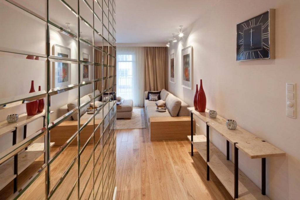 Шкаф-купе. Двери конструкции не занимают дополнительного пространства, так как открываются в параллельном направлении к стене. Во многих моделях такой мебели отсутствует стенка, что делает их намного компактнее. Кроме этого, подобными модулями часто заставляют угловое пространство. Шкафы позволяют хранить много вещей и аксессуаров, смотрятся эстетично.