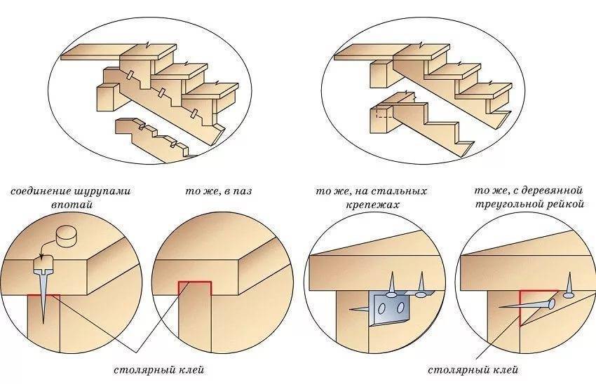 Установить ступени не составит особого труда. Вырезы косоуров промазывают клеем и приставляют к ним подступенки, которые затем необходимо выровнять и закрепить с помощью шурупов.