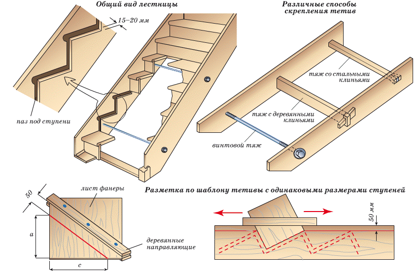 Главное отличие заключается в способе опирания ступеней. В лестницах на косоурах ступени опираются на доски сверху, а в лестницах на тетивах ступени располагаются между досками (тетивами). Когда происходит воздействие вертикальной нагрузки на ступень, проступь прогибается вниз, а затем выпрямляется. При этом на ее концах образуется распор. Чтобы тетивы не разошлись в стороны, их рекомендуется соединять металлическим прутком диаметром 8-12 мм с резьбой на концах и гайками. Также можно применять тяжи других конструкций.