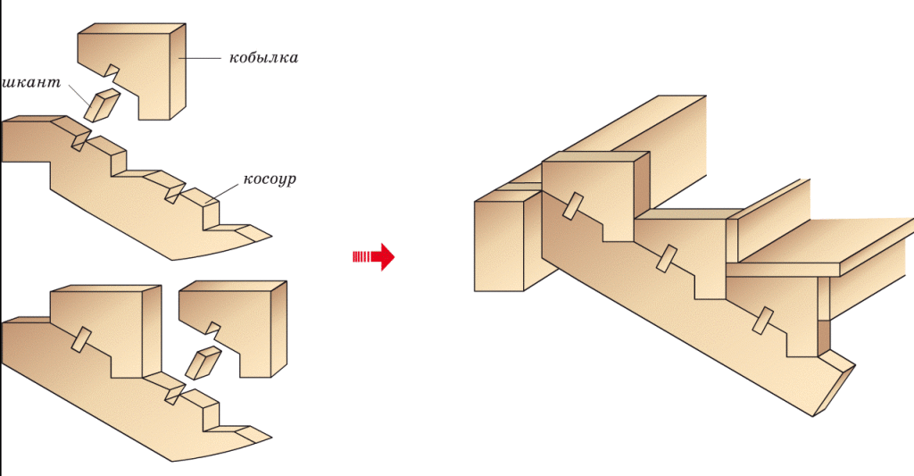 Тетивы очень схожи с косоурами, но всегда идут в паре. Причина тому особое крепление ступеньки внутри паза, а не поверх.