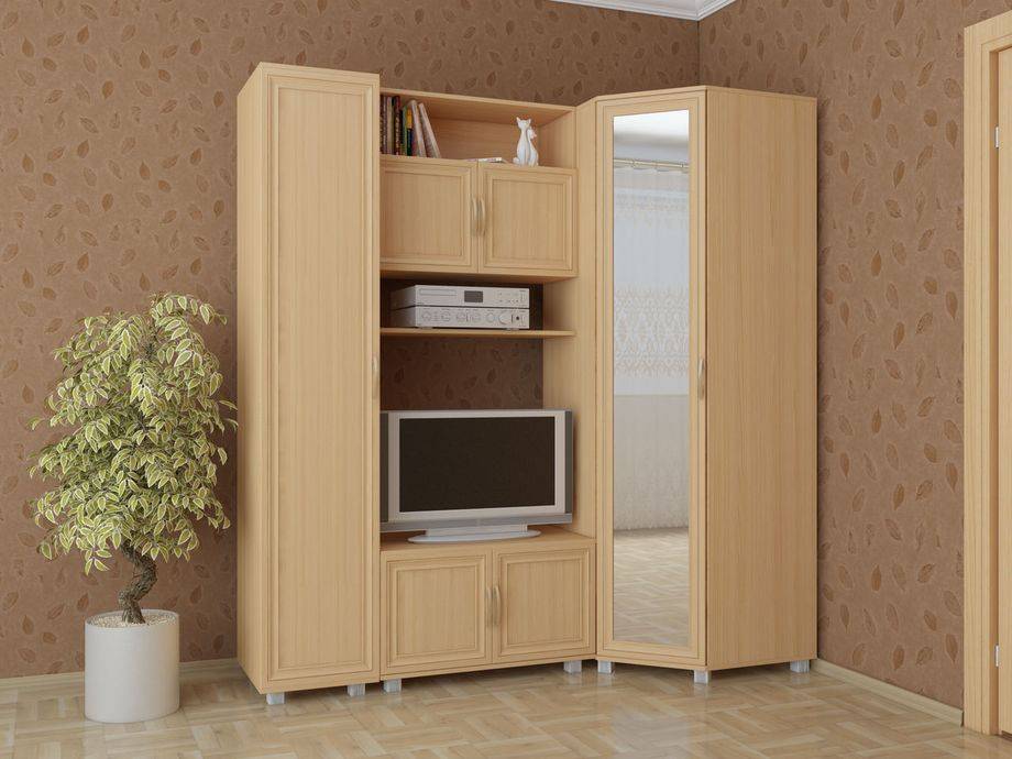 Угловые мини-стенки идеально подходят для малогабаритной комнаты. Как правило, такой гарнитур занимает две стены или выступает на вторую лишь частично. Обязательное условие – наличие углового шкафа или пенала. Комплект считается максимально вместительным при рациональной затрате площади, поскольку самая массивная часть занимает глухое угловое место, которое обычно заставляют торшером, ширмой или декоративным растением. Как модульные, так и корпусные модели одинаково популярны.