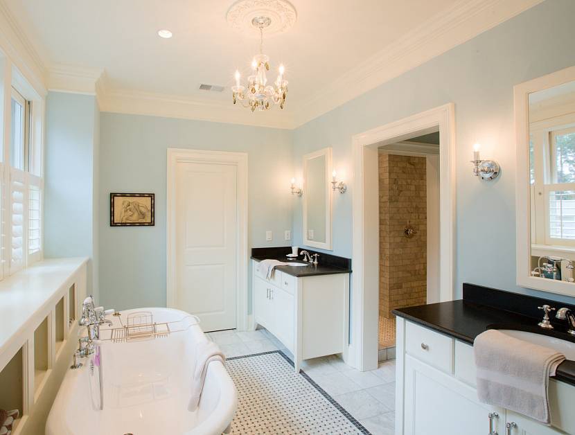 В синей ванной нужно выбрать мебель и сантехнику в светло пастельных тронах.