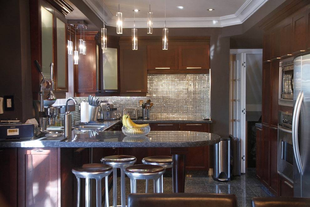 Зеркальное покрытие хорошо сочетается с хромированными поверхностями посуды. Если кухня совмещена с гостиной, такой фартук станет дополнительным украшением интерьера.