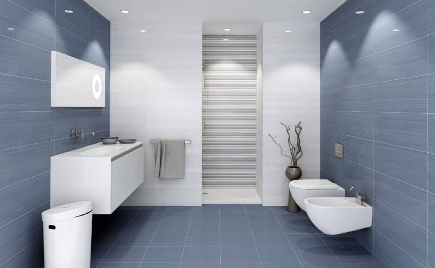 Отличное контрастное оформление стен рельефным кафелем. С помощью такого подхода удается зонировать комнату на два и более участков. В моде белый и серый тон с глянцевым покрытием. Что касается напольного покрытия, то здесь уместно использовать ребристый кафель с темно-синим отливом.