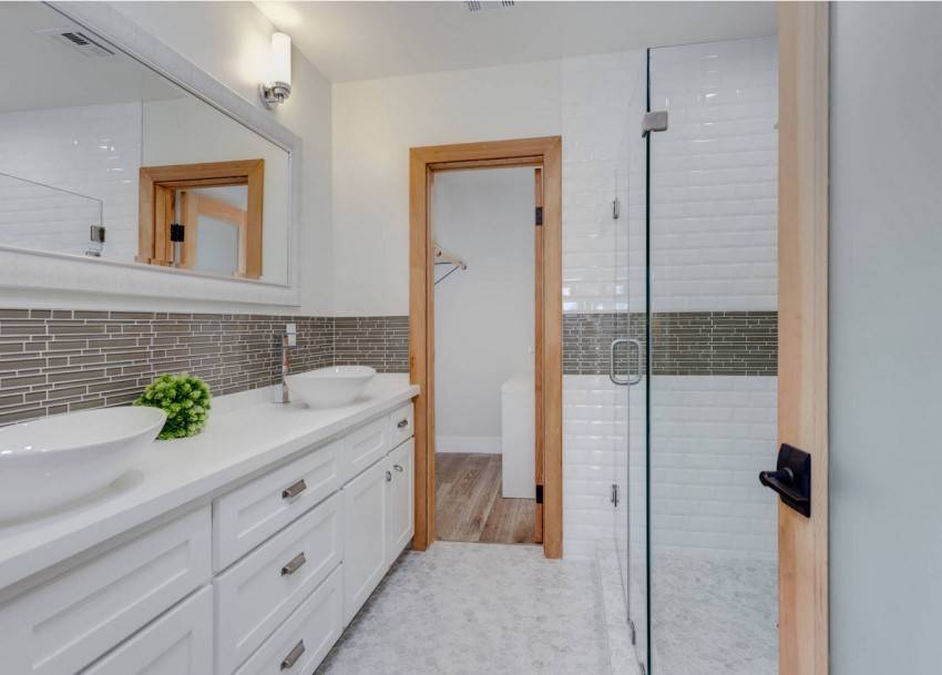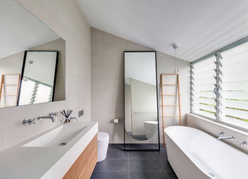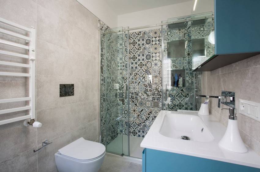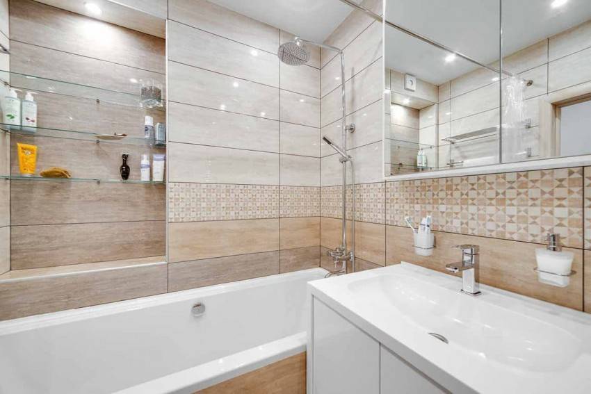 Дизайн ванной с мозаикой и полноразмерной плиткой