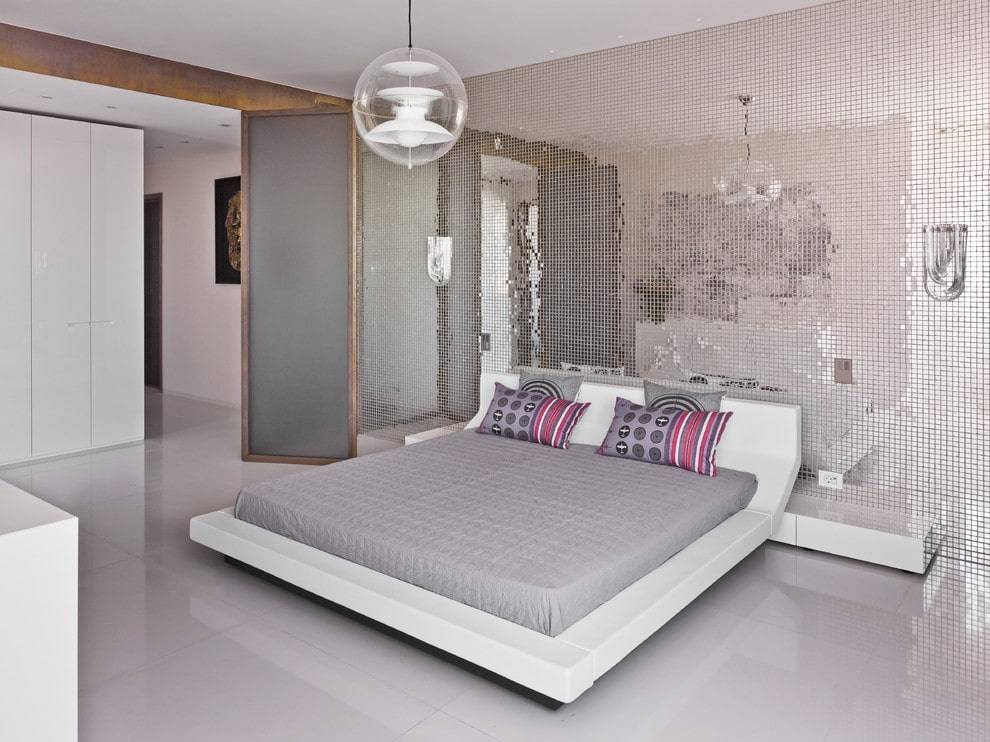 На фото футуристический интерьер спальни с акцентной стеной, полностью облицованной зеркальной мозаикой.