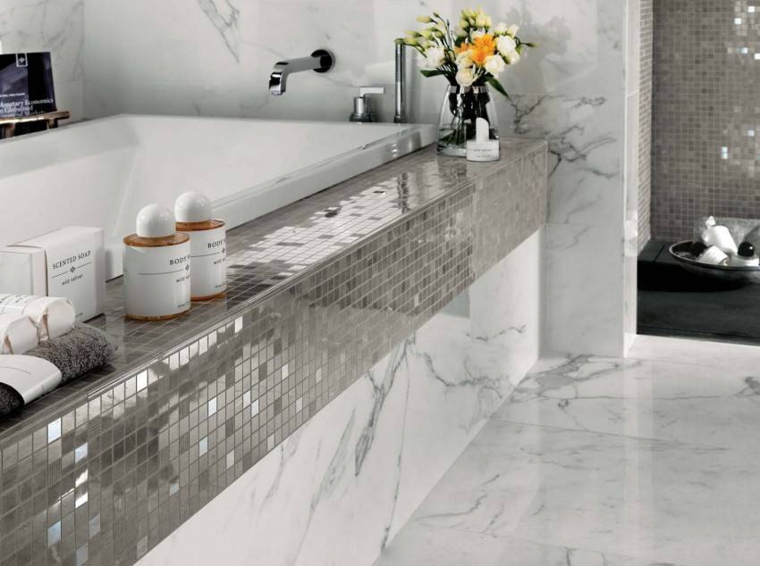 Комбинировать варианты отделки не только можно, но и нужно. Комбинации мозаики и полноразмерной плитки восхитительны. Так как размеры плит разные, можно сотворить нечто оригинальное и уникальное.