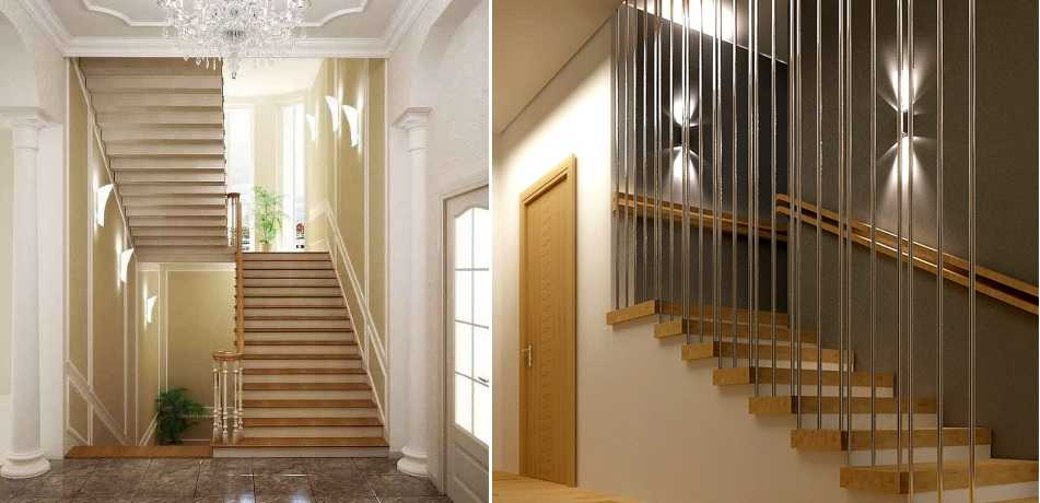 Количество светильников выбирают так, чтобы все ступени были хорошо освещены. Чтобы в ночное время свет не был слишком ярким, при планировании проводки можно подключить бра к двум выключателям — через один. Чтобы света было достаточно, но он не был слишком ярким.