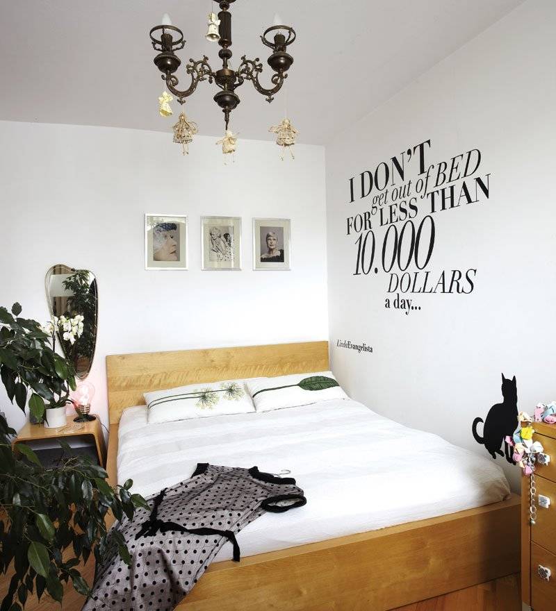 Выбирать текстовый декор следует, принимая во внимание общий стиль оформления и назначение помещения. Для спальни рекомендуются настраивающие на расслабление и отдых, умиротворяющие фразы, написанные буквами с мягкими очертаниями, спокойного пастельного или приглушенного цвета