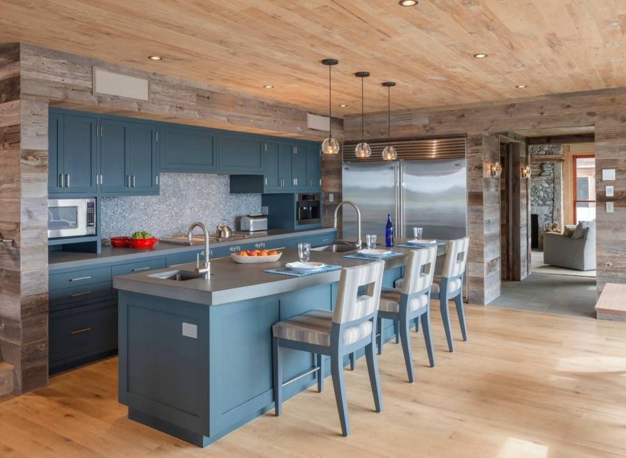 Облицовка из деревянных брусьев придает помещению изыска и уюта. Если интересует, какой выбрать потолок на кухне, чтобы он был безопасным, то лучше натурального дерева не найти, поскольку это природный и экологичный материал. Основные преимущества:
