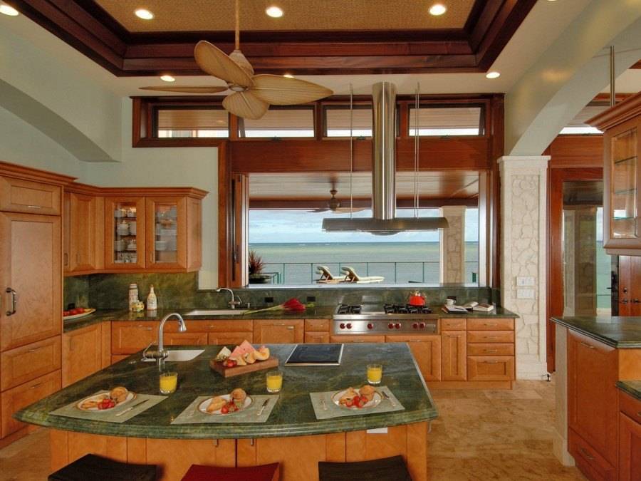 Если кухня островная, то отдельный уровень часто выносится непосредственно над ней. Это не только красиво, но и позволяет решить задачу с ее подсветкой. Ведь светильники можно элегантно разместить непосредственно на нем.