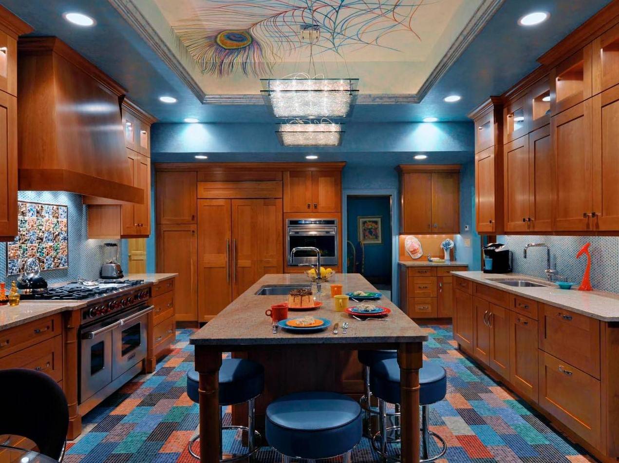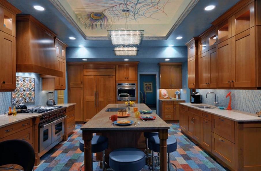 Потолок может быть гладким и белым или иметь декоративную структуру и форму, а также насыщенный цвет. На сегодняшний день существует масса идей по адаптации верхней части кухни. Вариантов расположения потолков много. Они могут быть: