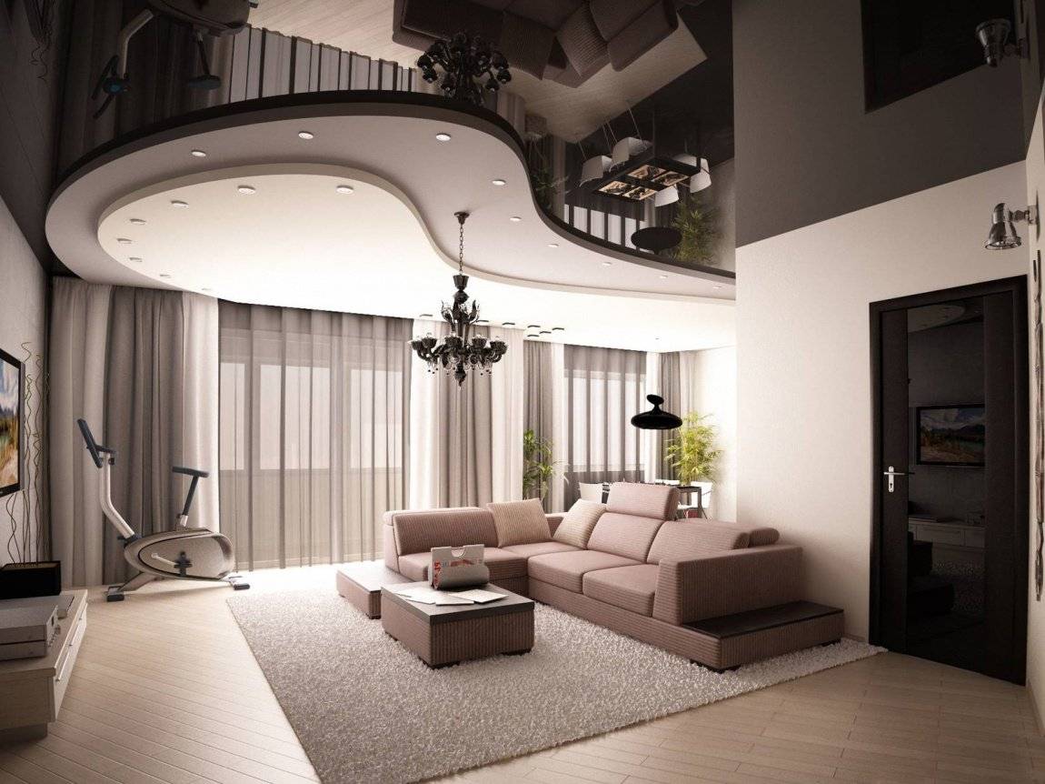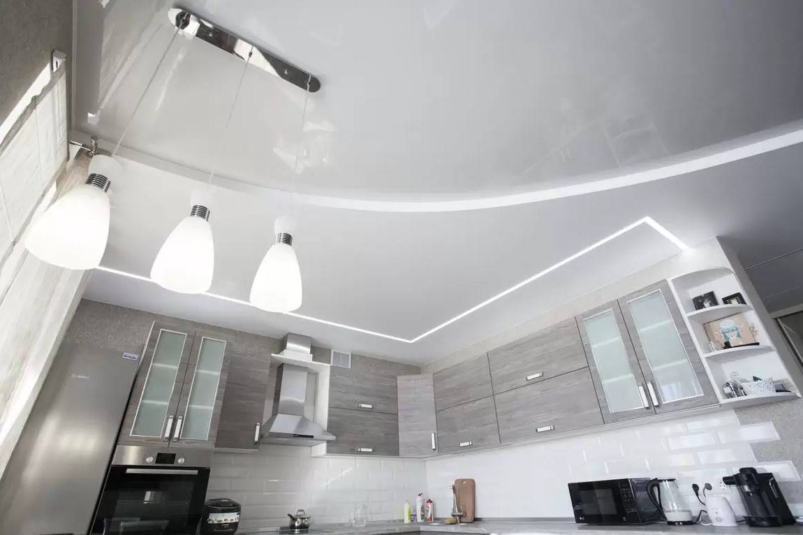 Самый сложный вид натяжного потолка, чаще всего использующийся в больших кухнях-гостиных для грамотного зонирования помещения.