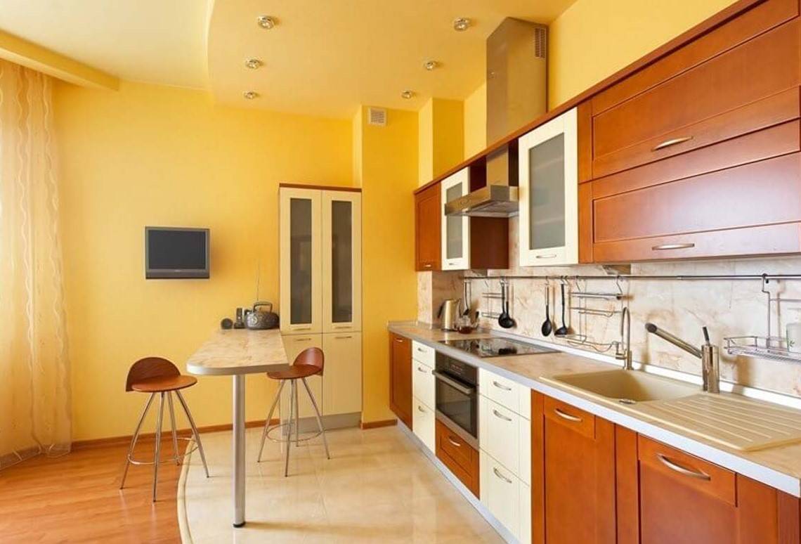 - невозможность изменить свет. Отверстия для установки светильников делаются сразу, а после их перенести нельзя. Но на кухне сложно сделать перепланировку, поэтому перенос и не требуется. Главное — сделать точечные источники света и над рабочей, и над обеденной зоной;