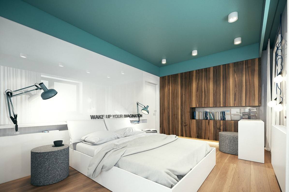 На фото интерьер современной спальни с матовым потолком бирюзового цвета.