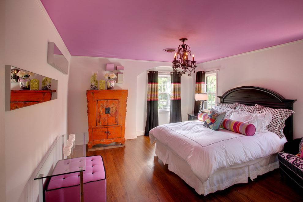 Привносит в обстановку света, свежести и позитива. Розовое потолочное оформление смотрится очень изысканно и элегантно.