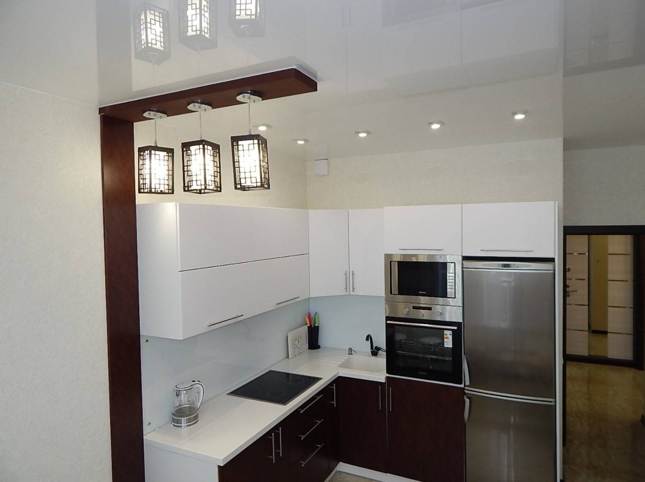 Дизайн двухуровневого потолка – превосходный способ зонирования. С помощью чередования глянцевого полотна и матовых вставок из гипсокартона можно отделить кухню от гостиной, кухню от столовой, обеденную зону внутри кухни и т.д.