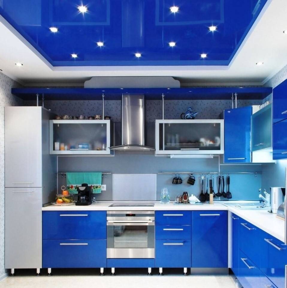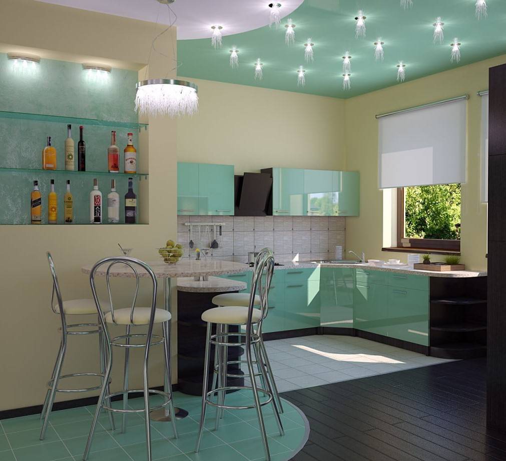 Прекрасная идея – декорирование потолка подсветкой, расположенной за полотном. Если же использовать при этом печать фото на пленке, то можно создать настоящее звездное небо у себя на кухне.
