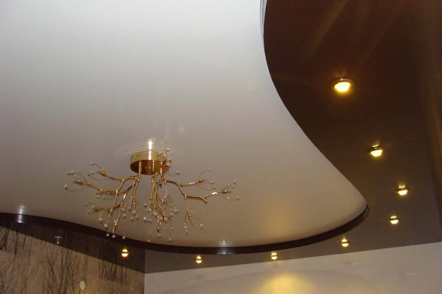 - Сочетание с разными приборами освещения. Для освещения натяжного полотна могут использоваться люстры и светильники точечного типа. Главное условие – правильно подобрать источник света для двухцветного потолка натяжного в одном уровне, чтобы от сильного нагревания не произошло повреждение полотна.