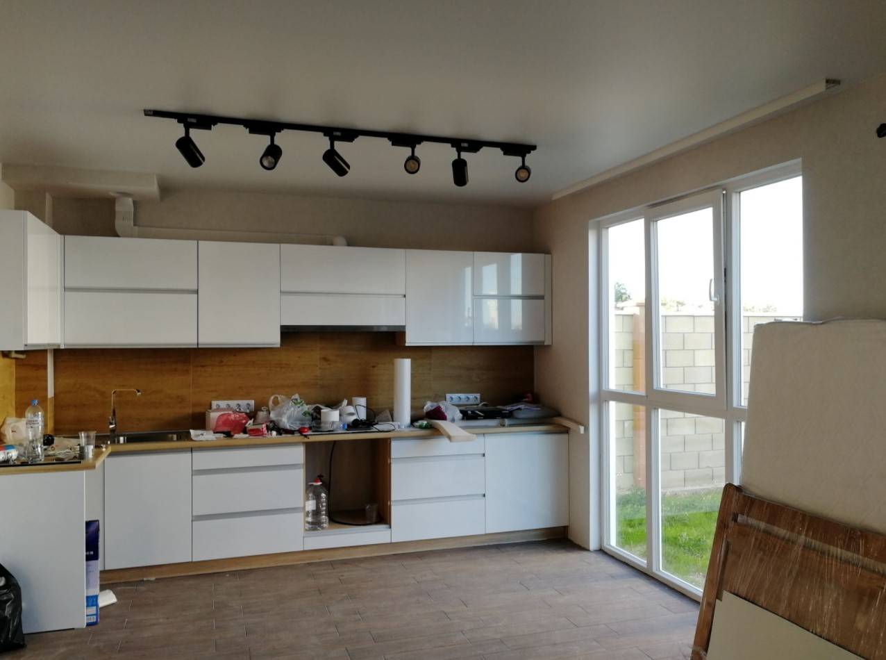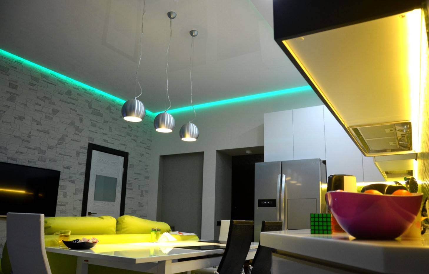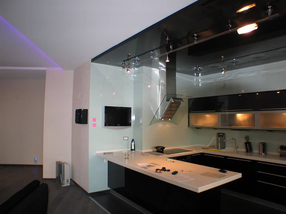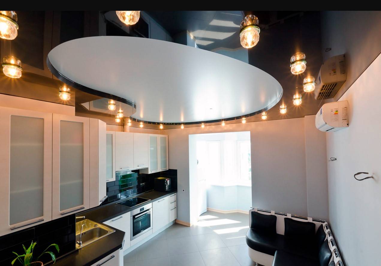 Кухня, совмещенная с гостиной и натяжные конструкции в ней