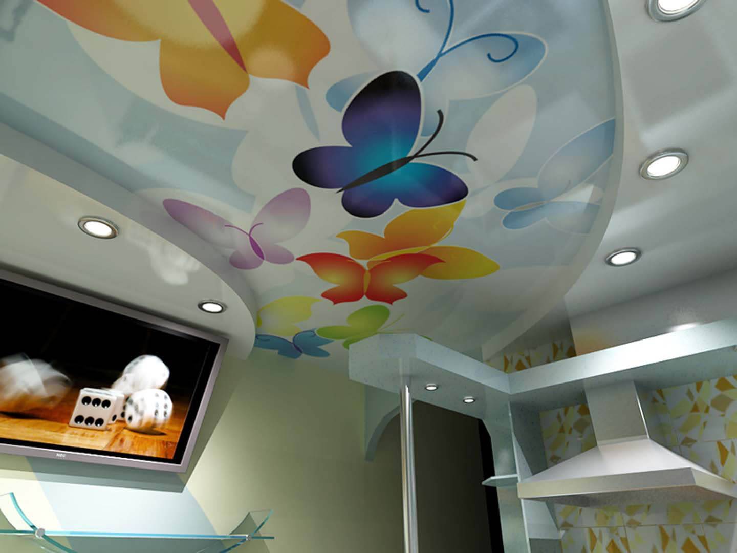 Если есть необходимость, можно зонировать потолок на отдельные участки, каждый из которых имеет свой цвет.