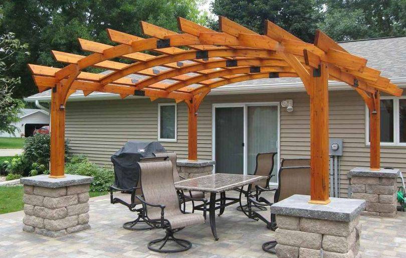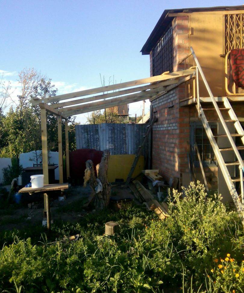 Каркас для постройки около дома часто делают из деревянного бруса или металлической трубы. Также конструкции рядом с домом сооружают из кирпича или камня, а также заливают цементными опорами.