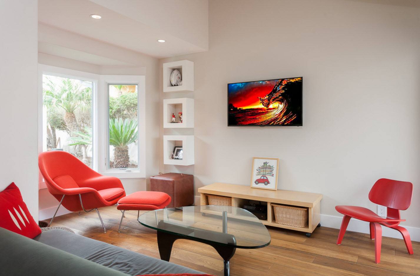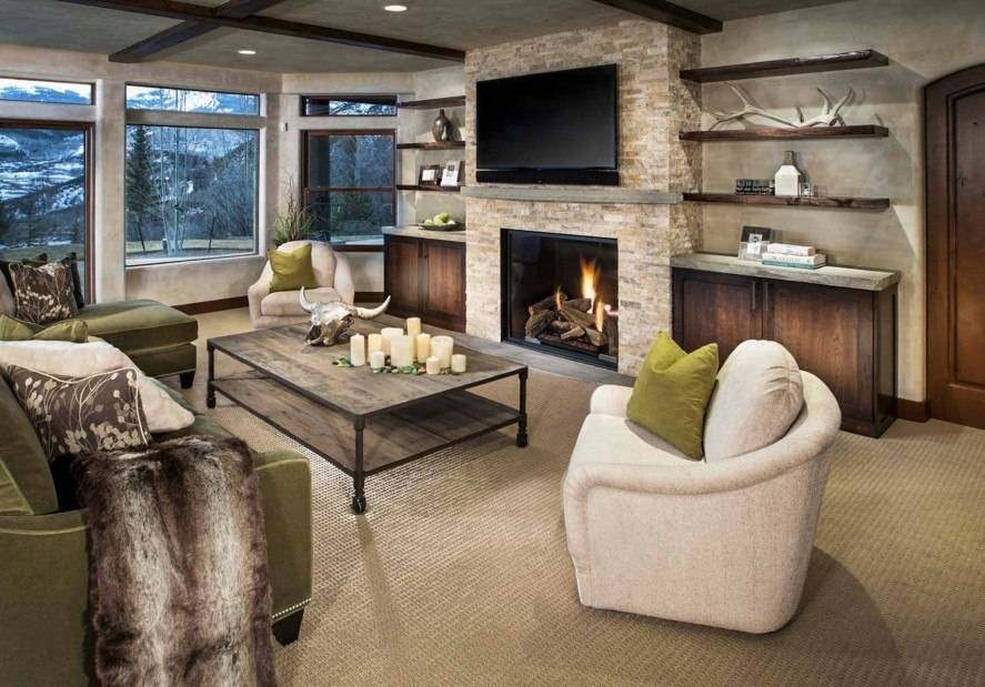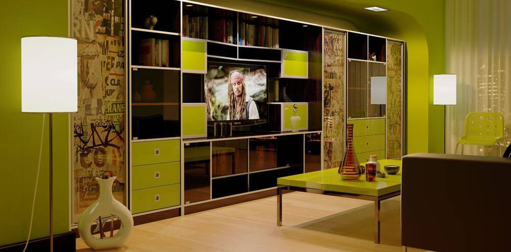 Для такого интерьера гостиной, одинаково хорошо подойдут модели, как в монохромных, так и контрастных оттенках. Украсить стенку и придать ей завершающих штрихов, поможет определенное наполнение.