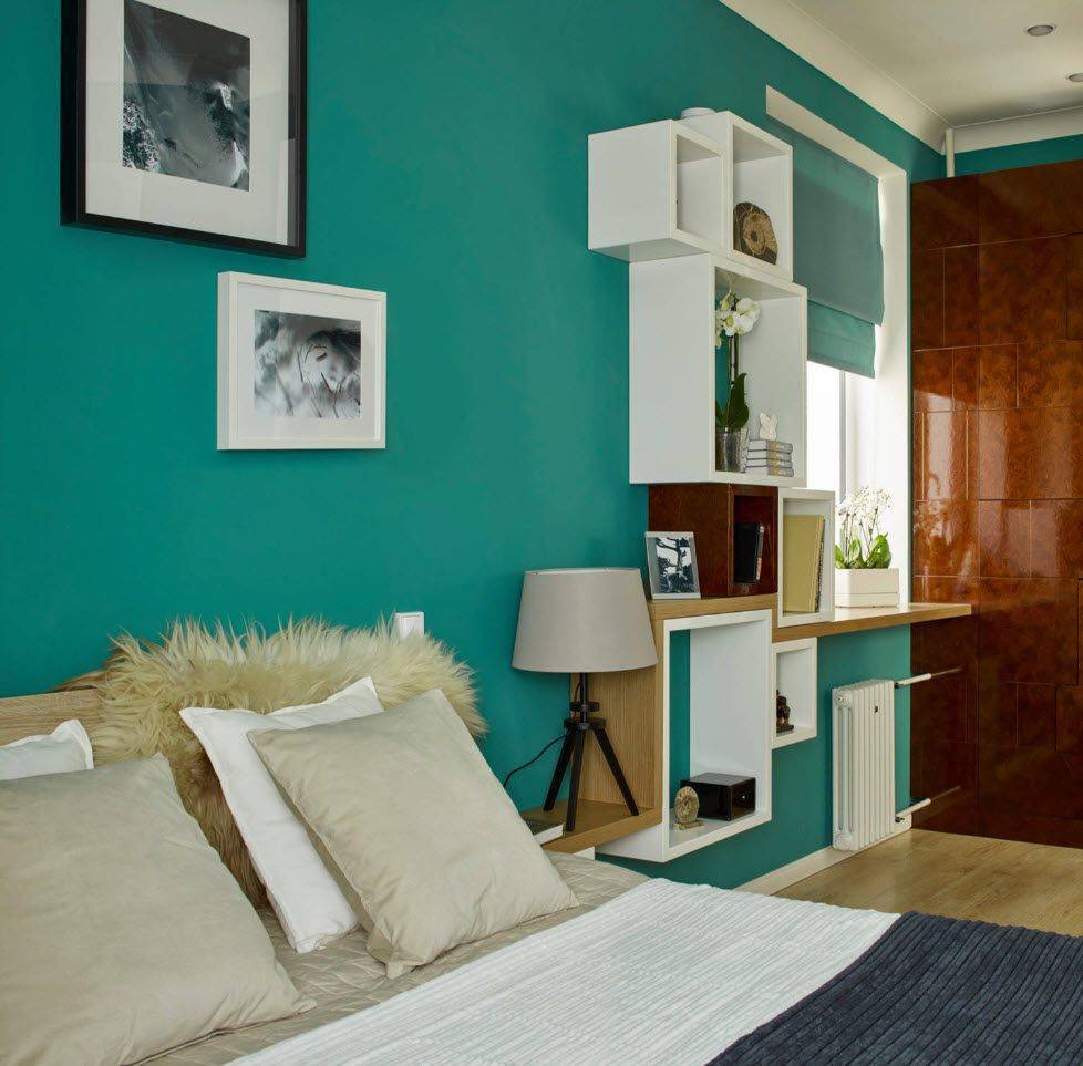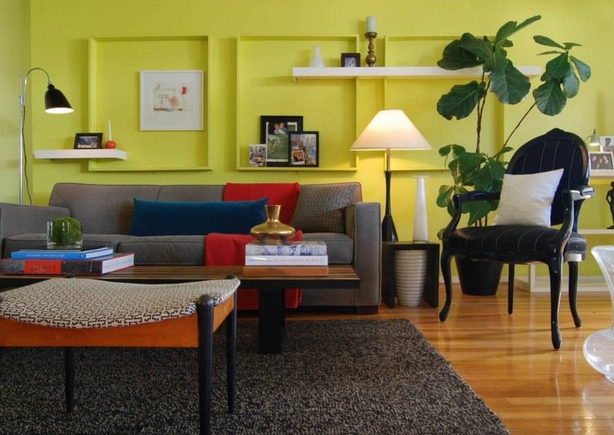 - Минимализм. Полок в таком интерьере немного, зато их форма, размеры и расцветка могут быть абсолютно любыми. Подойдут двухцветные образцы (черный и белый, желтый и зеленый, красный и черный и т.д.) и однотонная мебель (черная, белая, бежевая, персиковая, зеленая, бордовая и пр.). Можно предпочесть классическую форму, но она проигрывает асимметричным, круглым или квадратным. Мебель для стиля минимализм не имеет декоративных элементов.