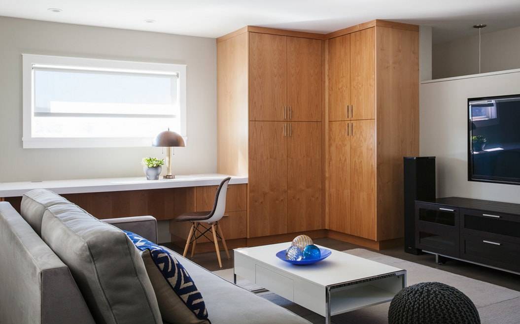 Подобные секции занимают в помещении мало места, при этом могут вмещать в себя большое количество вещей. Под навесными шкафами можно разместить другие отделения, подставку для телевизора или комод. Эту мебель можно вешать не только по середине стены, но и под потолком в комнате. Сегодня выпускают также угловые модели навесных секций.