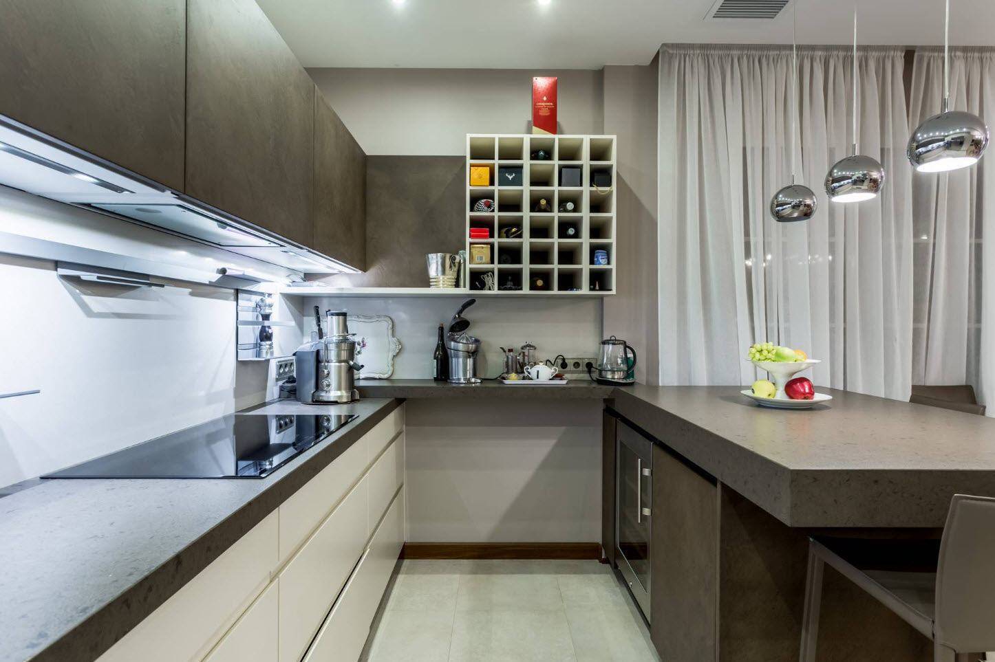 Причем не обязательно все модули должны быть закрытыми. Можно оформить часть элементов в виде открытых полок и этажерок, где гармонично разместятся книги, праздничная посуда, предметы декора.