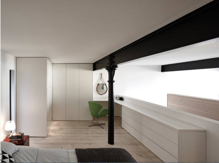 В данной стилистике допускается применение мебели с некоторой потертостью и эффектом старины, способствующей созданию атмосферы чердачного помещения. В качестве материалов используют стекло, дерево, металл, пластик, цветовую гамму выдерживают в более темных, приглушенных серых, коричневых, кирпичных или черных тонах.