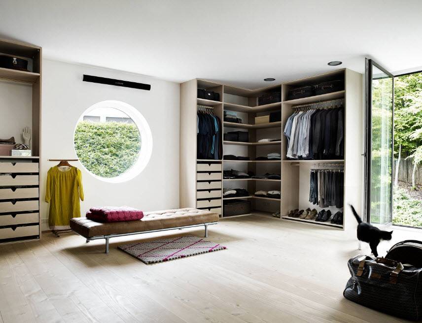 Если полки будут служить элементом декора и держать на себе аксессуары, расположите их на видном месте. Закрытые полки под одежду и посуду могут занять любое свободное пространство.