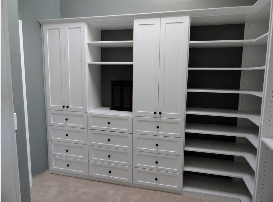 - Открытые, закрытые, смешанные. Закрытые конструкции имеют двери, а открытые – нет. У них есть только корпус и полки. Смешанные шкафы могут иметь и то и другое.