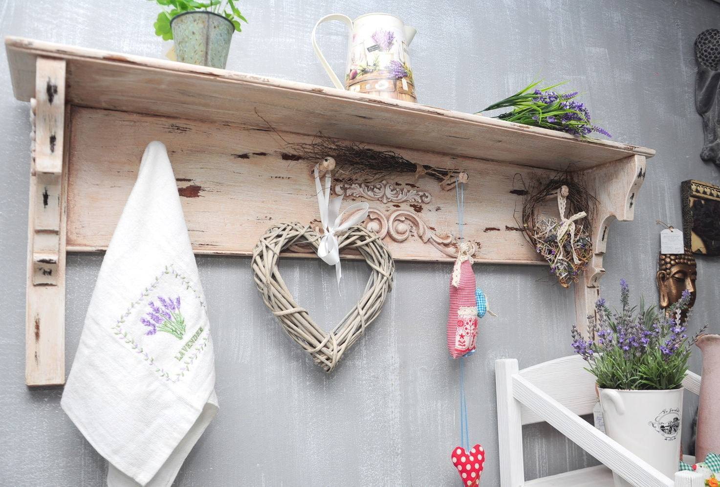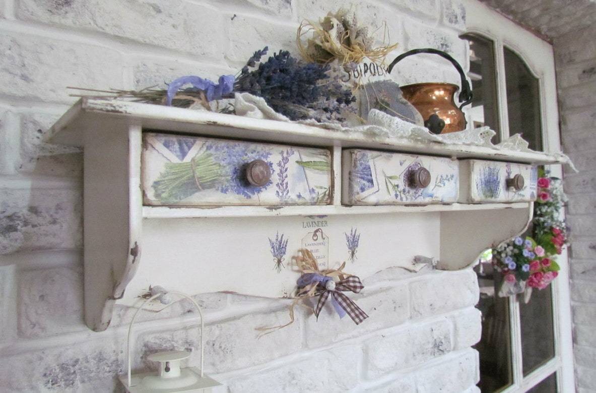 Для оформления подбираются деревянные полочки, покрытые краской белого цвета или винтажные конструкции с эффектом состаривания. Небрежное исполнение наделит обстановку особым очарованием. Модели могут быть декорированы при помощи ковки, резьбы, патины, декупажа или занавесок с цветочными рисунками.