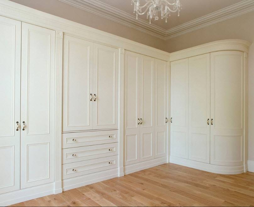Радиусные угловые шкафы очень интересно и необычно выглядят за счет плавных линий фасада. Такой вариант отлично смотрится практически в любом интерьере, что делает его универсальным. Однако процесс создания данной конструкции довольно трудоемкий, что не могло не сказаться на цене.