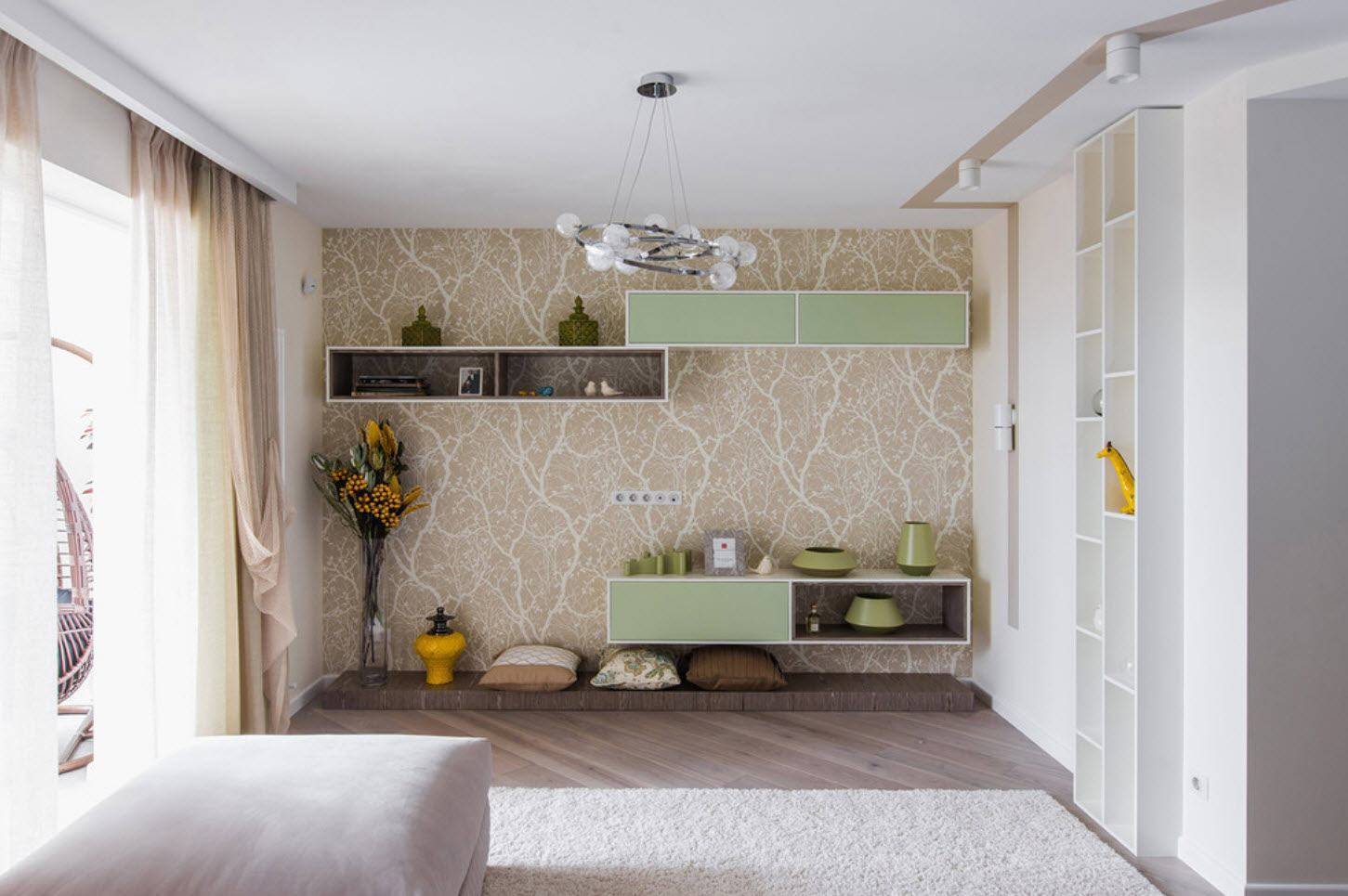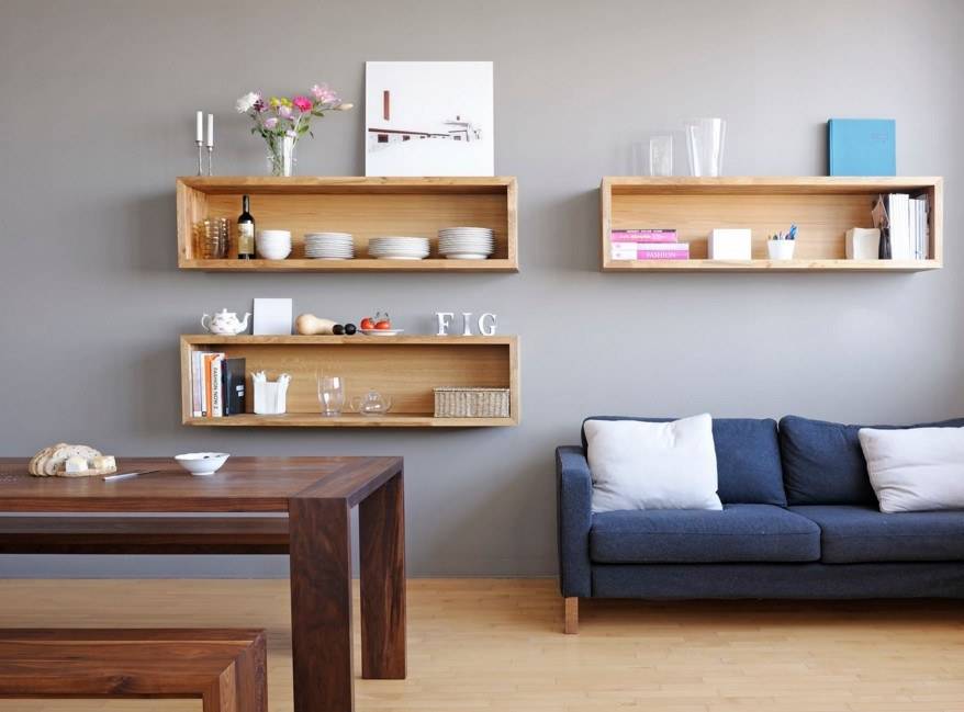 Для размещения полок понадобится пустое пространство. Если конструкция настенная, то идеальным вариантом расположения станет стена над диваном или телевизором. А также удобно разместить полки в углу, если этот участок свободен от другой мебели.