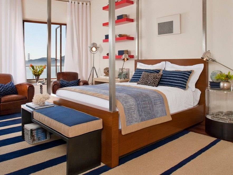 Интересно смотрятся стойки-этажерки, которые укрепляются к потолку несущими рейками. Они не пригодны для хранения верхней одежды, но повседневную одежду, обувь и белье можно расположить в закрытых отсеках, а на открытых полках расположить книги и декор. В центральной части такого комплекса можно организовать нишу под телевизор.