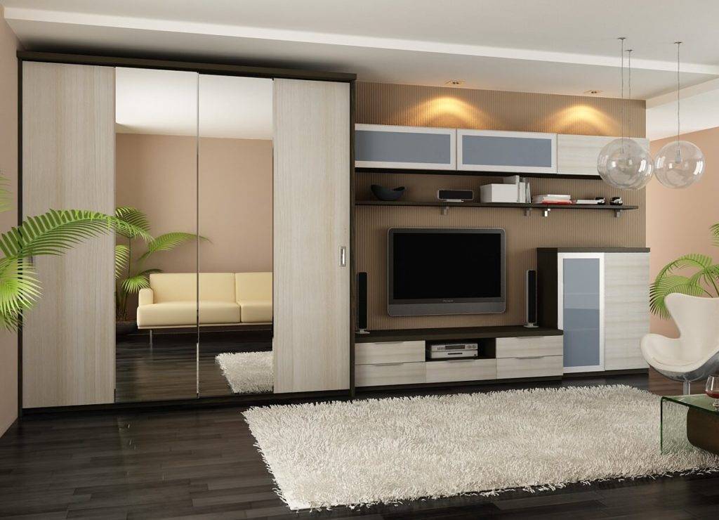 Встраиваемая конструкция – это эффективное использование пространства и функциональное решение для хранения вещей. Встроенные шкафы до потолка в гостиной лучше устанавливать в помещениях с низкой или нормальной высотой потолков, это станет прекрасным интерьерным решением и визуально сделает комнату выше. А вот в помещениях с высокими потолками он выглядит громоздко и в них рекомендуют ставить корпусную стенку.