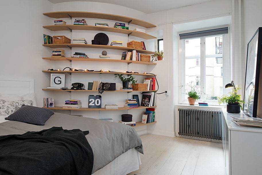 На фото спальня в скандинавском стиле с деревянными полками на стене полукруглой формы.