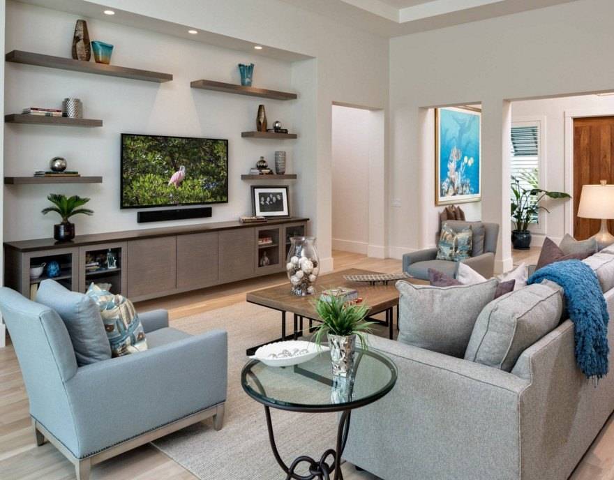 Для такого интерьера гостиной, одинаково хорошо подойдут модели, как в монохромных, так и контрастных оттенках. Украсить стенку и придать ей завершающих штрихов, поможет определенное наполнение.