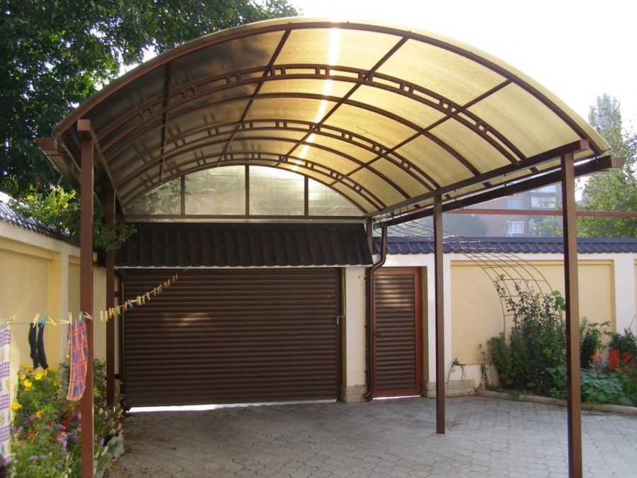 Куда более распространенным вариантом формы для поликарбонатного навеса является полукруглый – его можно встретить практически в каждом дворе. Степень закругленности детали из поликарбоната может быть разной, почти достигая полукруга или демонстрируя минимальную кривизну.