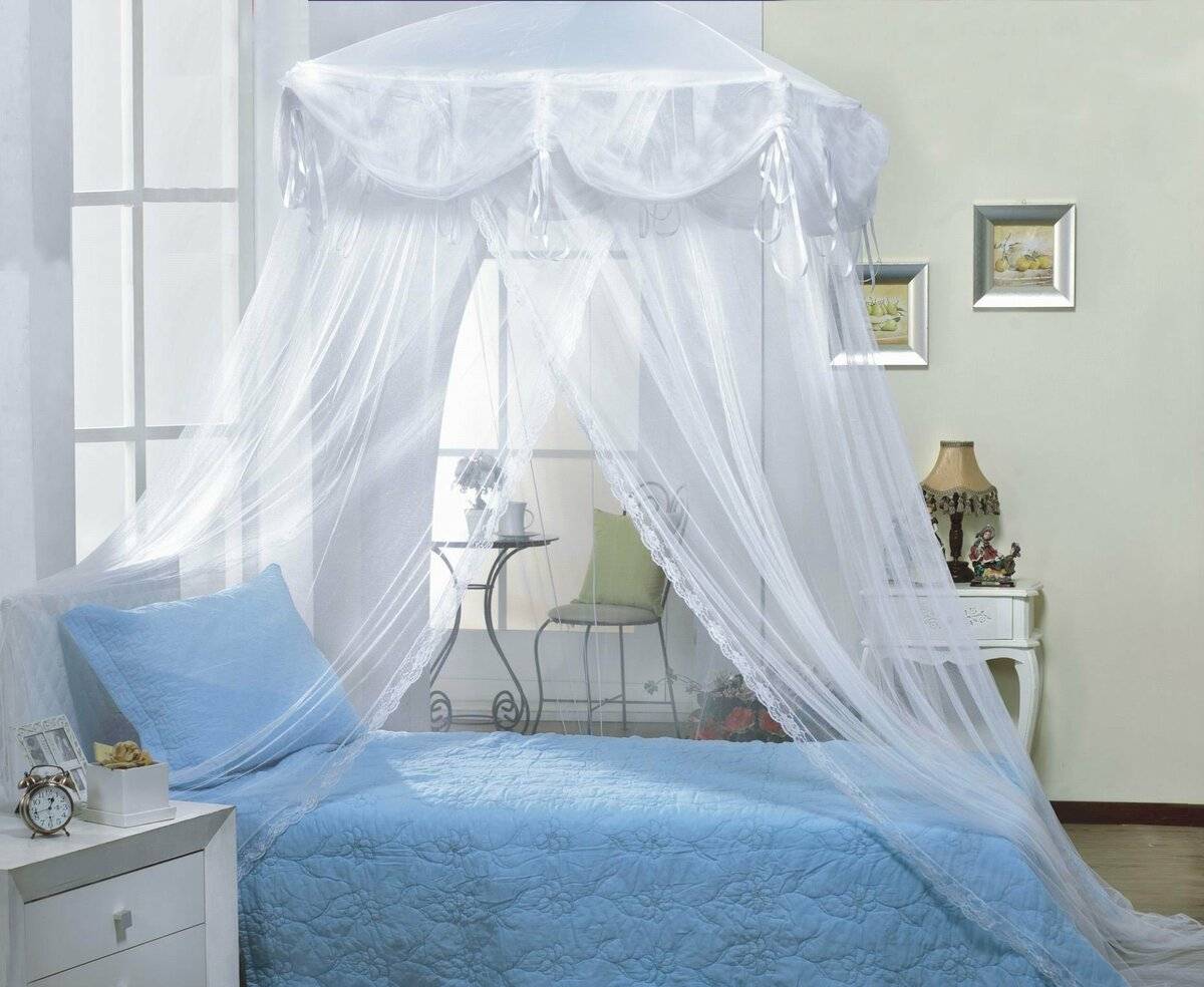 Балдахин над кроватью однозначно сделает комнату интересной и необычной.